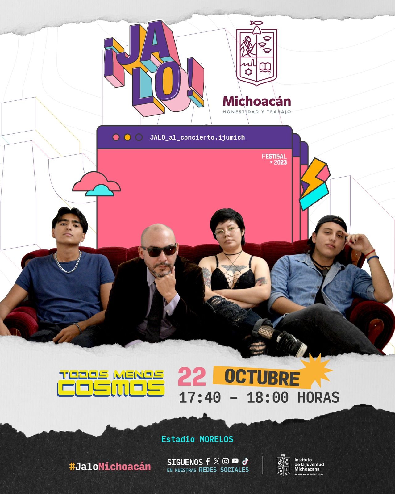 Morelia, Michoacán, 12 de octubre de 2023.- El talento moreliano se hará presente en los conciertos gratuitos del Festival Jalo con la presentación de 13 bandas locales que abrirán las presentaciones de El Tri, Molotov y Caifanes, los días 21, 22 y 23 de octubre en el Estadio Morelos.