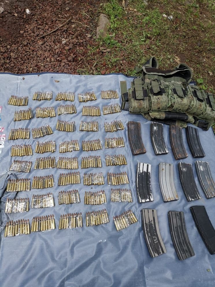 Jacona, Michoacán, a 25 de julio de 2021.- Una acción conjunta llevada a cabo entre elementos de las secretarías de Seguridad Pública (SSP), de la Defensa Nacional (SEDENA), así como de la Guardia Nacional (GN), permitió el aseguramiento de dos automotores, en cuyo interior fueron encontrados un fusil, 400 cartuchos útiles, 11 cargadores, 9.25 kilogramos de hierba color verde con las características de la marihuana, así como 200 envoltorios con una sustancia granulada, al parecer metanfetamina.