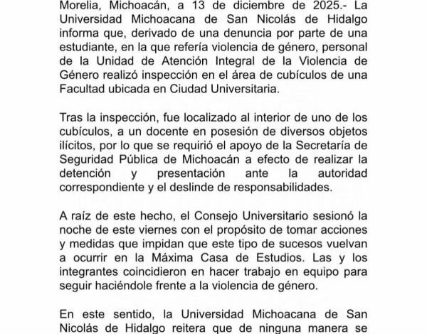 Morelia, Michoacán, a 13 de diciembre de 2025.- La Universidad Michoacana de San Nicolás de Hidalgo informa que, derivado de una denuncia por parte de una estudiante, en la que refería violencia de género, personal de la Unidad de Atención Integral de la Violencia de Género realizó inspección en el área de cubículos de una Facultad ubicada en Ciudad Universitaria.