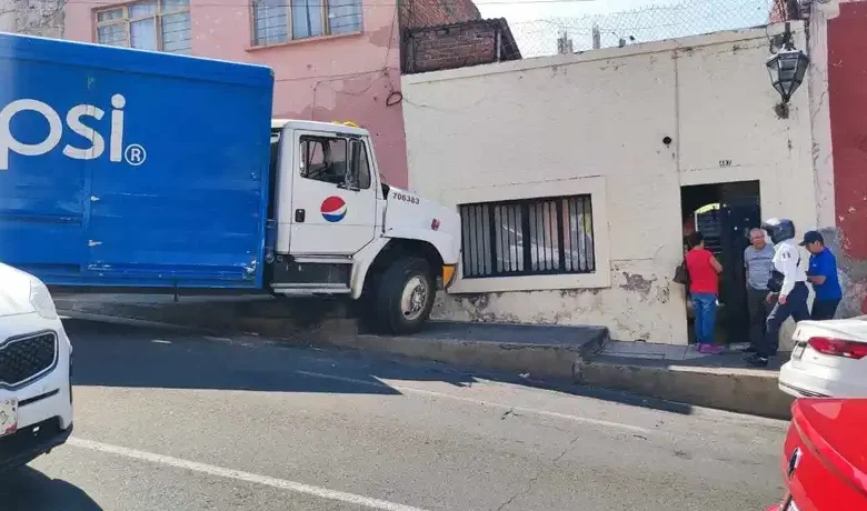 Morelia, 5 de marzo de 2025.- El conductor de un camión repartidor de la empresa Pepsi chocó contra una banqueta y la fachada de una casa tras fallarle los frenos cuando circulaba cuesta abajo sobre la avenida Héroe de Nacozari, al norte de Morelia.