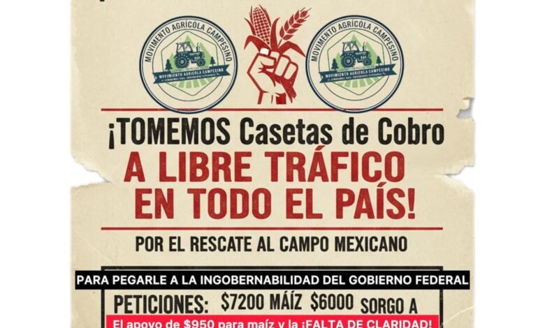 El Movimiento Agrícola Campesino MAC informa que ante la falta de claridad en el precio por tonelada de Sorgo y el apoyo insuficiente por parte del gobierno de solo 950 pesos por tonelada de maíz, han determinado convocar a todas las organizaciones y Campesinos a una #MovilizaciónNacional para tomar todas las #casetas del país y dejarlas al libre tránsito.