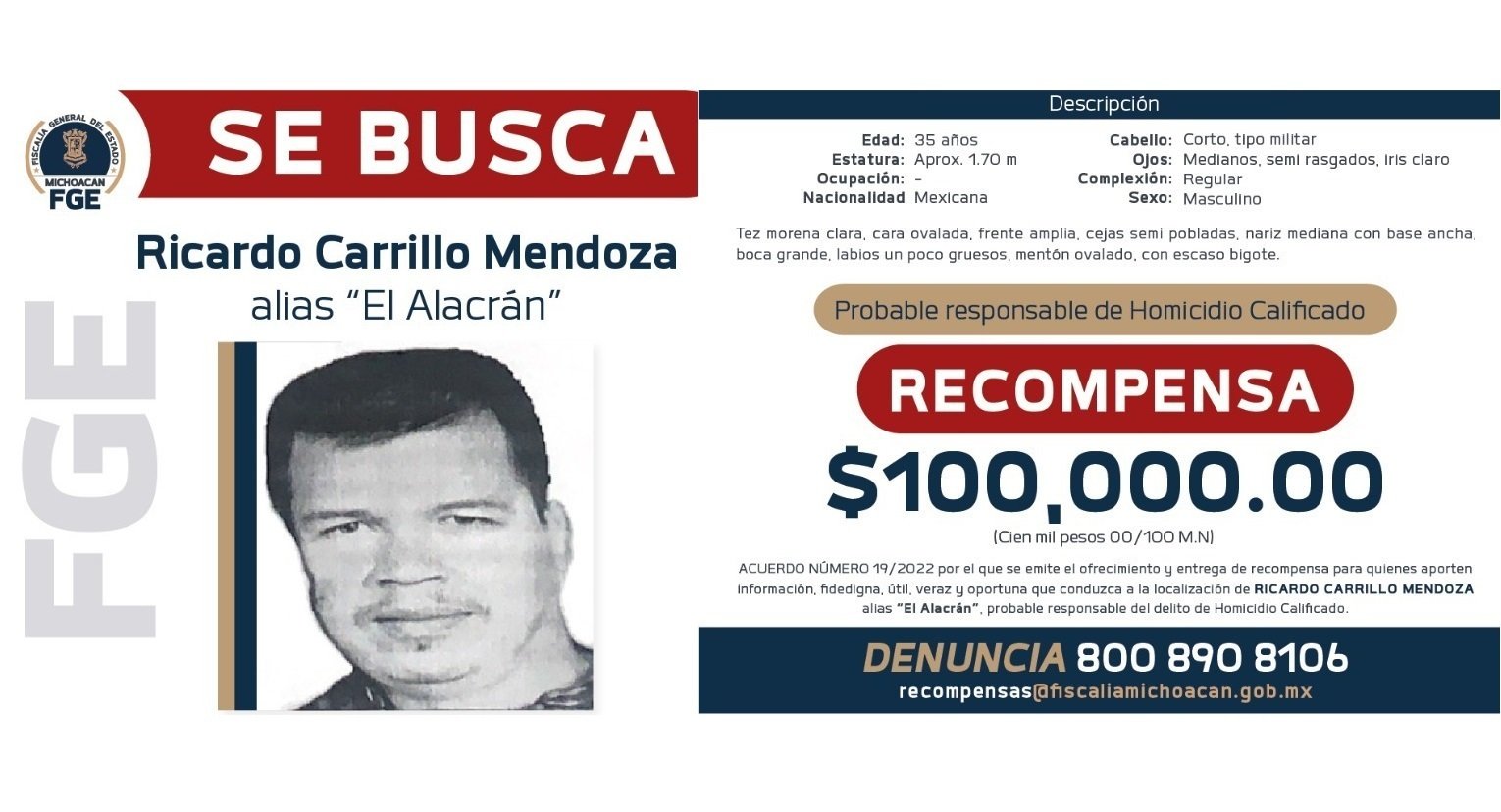 Ofrece recompensa para la localización y detención de Ricardo Carrillo Mendoza, El Alacrán Morelia, Michoacán, a 28 de marzo de…