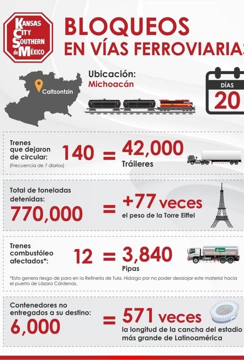 Cumple 20 días bloqueo a las vías del tren con afectaciones millonarias, 770 mil toneladas de mercancías detenidas y 6,000…