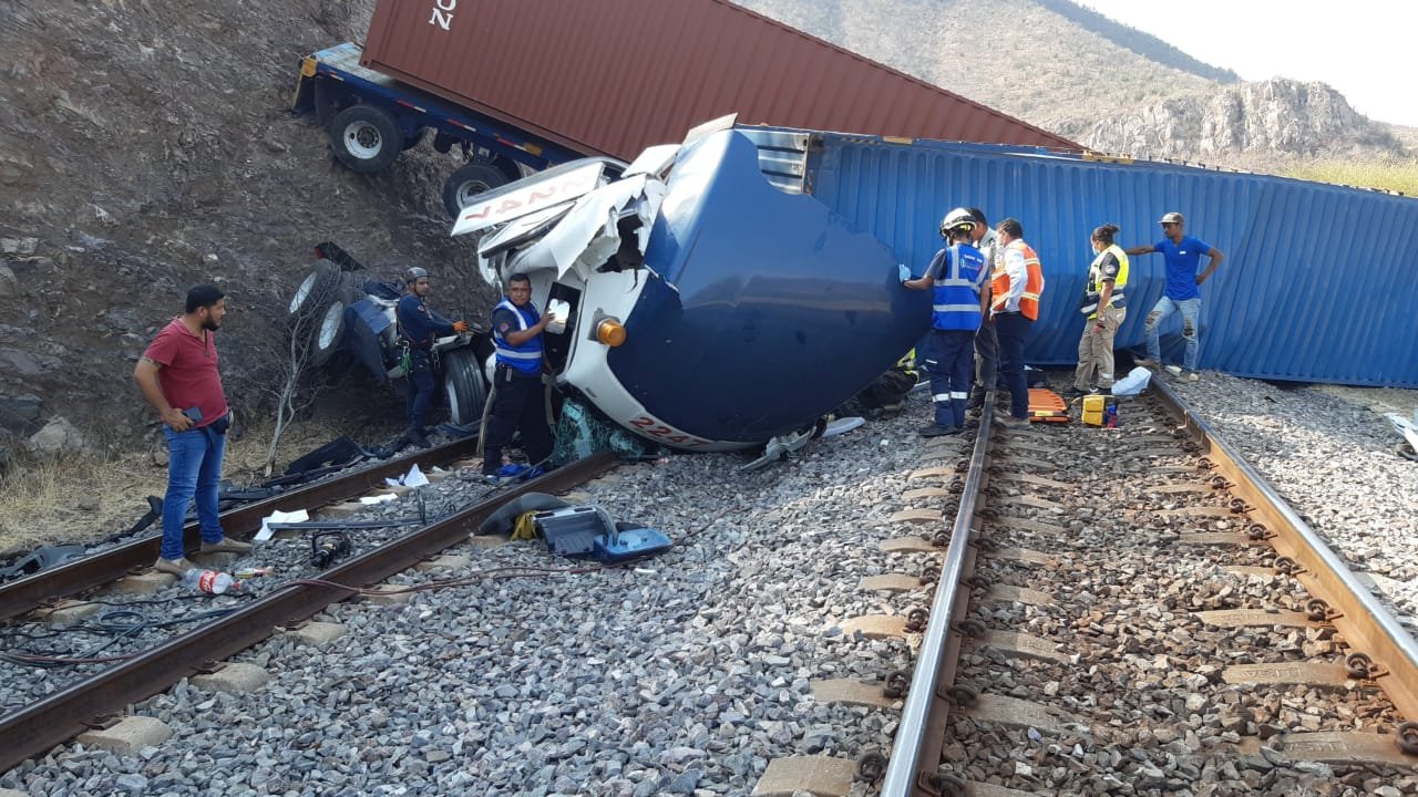 Cae tractocamión a un barranco y queda en las vías del tren en la «autopista» Siglo 21; hay dos lesionados