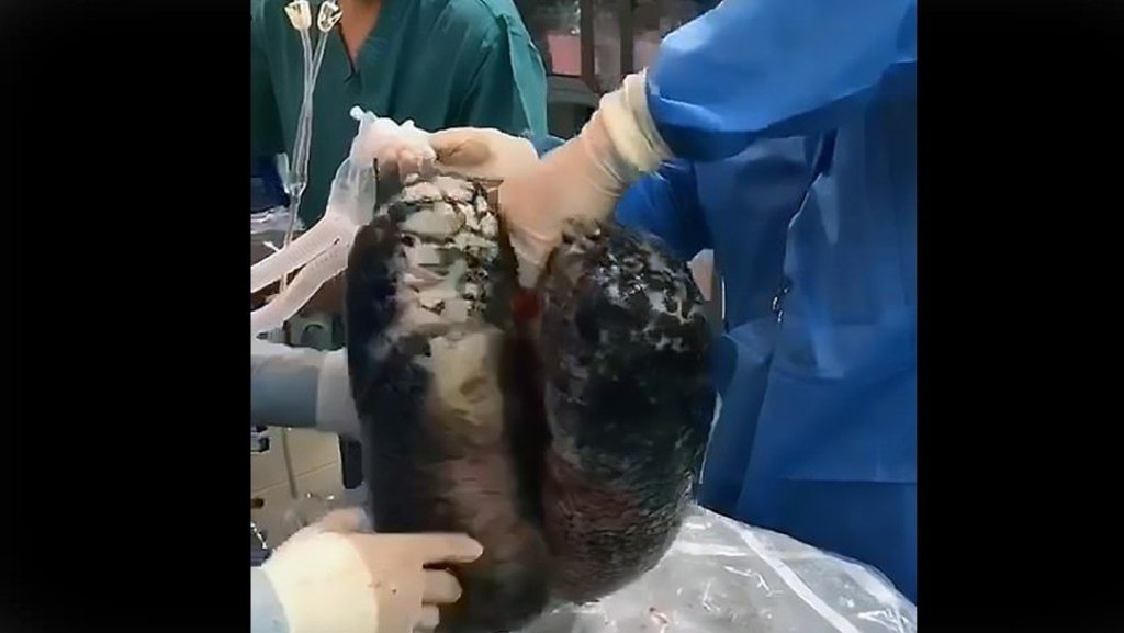 Médicos del Hospital Popular de Wuxi en Jiangsu, China, extrajeron los pulmones negros de un hombre de 52 años que…