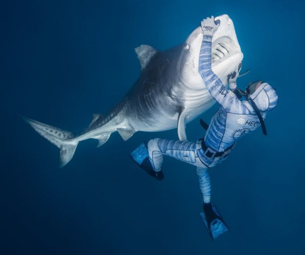Hombre logra calmar a tiburón gigante con tan solo un toque de su mano