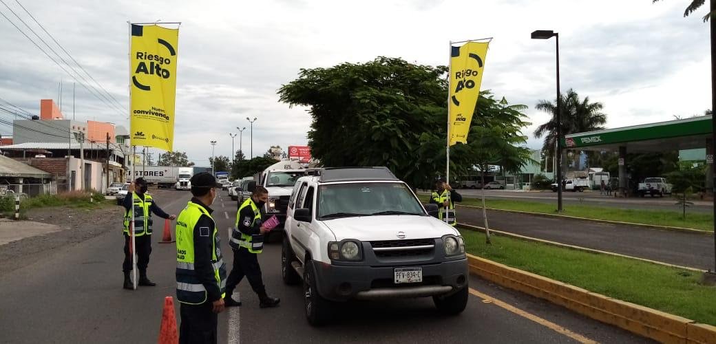 En dichos sitios, los agentes abordan a transeúntes y automovilistas, indicando la importancia sobre el uso de cubrebocas, lavado de manos con agua y jabón, así como mantener la sana distancia de 1.5 metros entre personas.