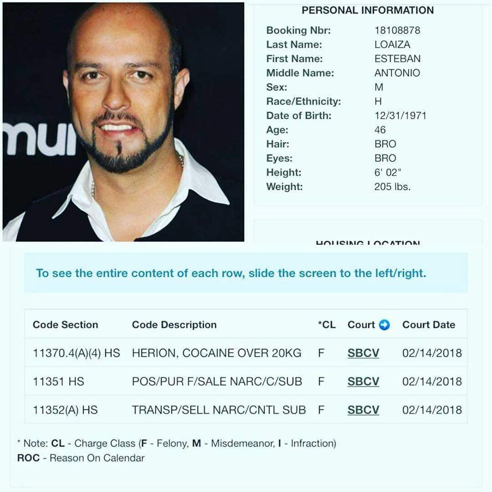 Esteban Loaiza fue detenido el pasado viernes en San Diego por posesión de 20 kilogramos de cocaína, de acuerdo con una ficha que circula en redes sociales del Departamento de Sheriff del Condado de San Diego.
