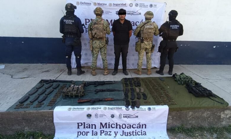 La detención ocurrió alrededor de las 17:30 horas durante recorridos de prevención y vigilancia sobre el tramo carretero Las Maravillas de Acahuato–El Molinito, en el marco del operativo “Paricutín, Plan Michoacán por la Paz y la Justicia”, en coordinación con personal de la Secretaría de la Defensa Nacional.