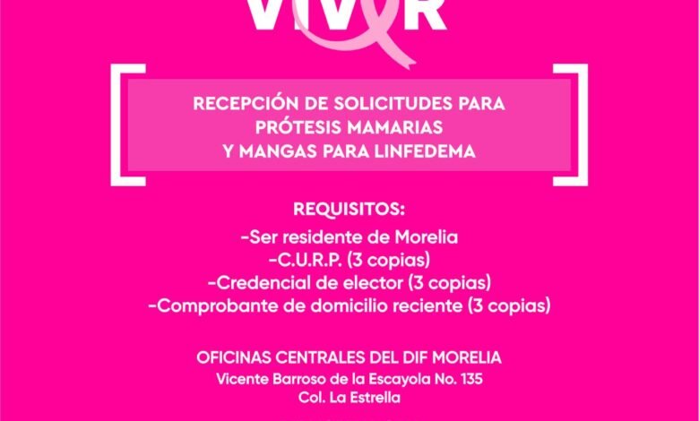 Morelia, Michoacán; 2 de octubre de 2025. – El DIF Morelia que encabeza la presidenta honoraria, Paola Delgadillo Hernández, abrió la recepción de solicitudes para la entrega gratuita de prótesis mamarias externas y mangas oncológicas, en el marco de la campaña del mes de octubre “Prevenir es Vivir”.