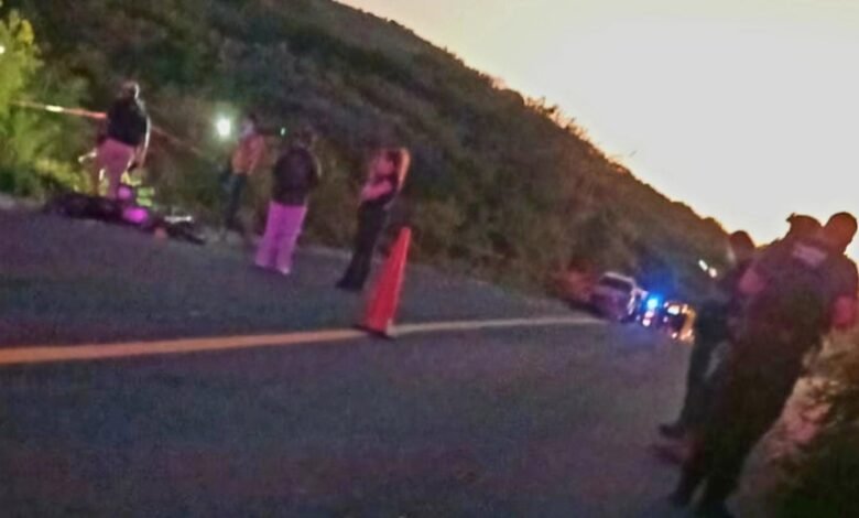 El cuerpo sin vida de uno de los hombres en el acotamiento del lado izquierdo de la carretera y junto a una moto tipo Italika. Este individuo, aún no identificado, vestía pantalón de mezclilla gris y botas de trabajo.
