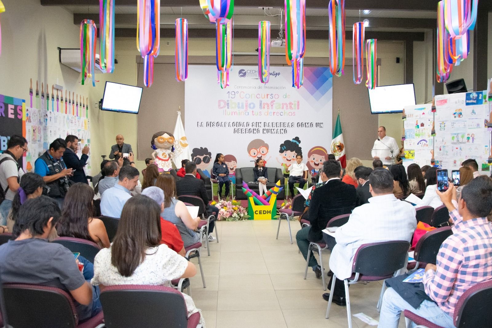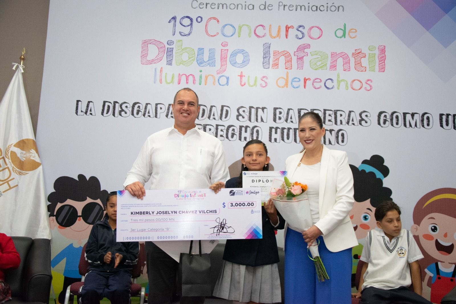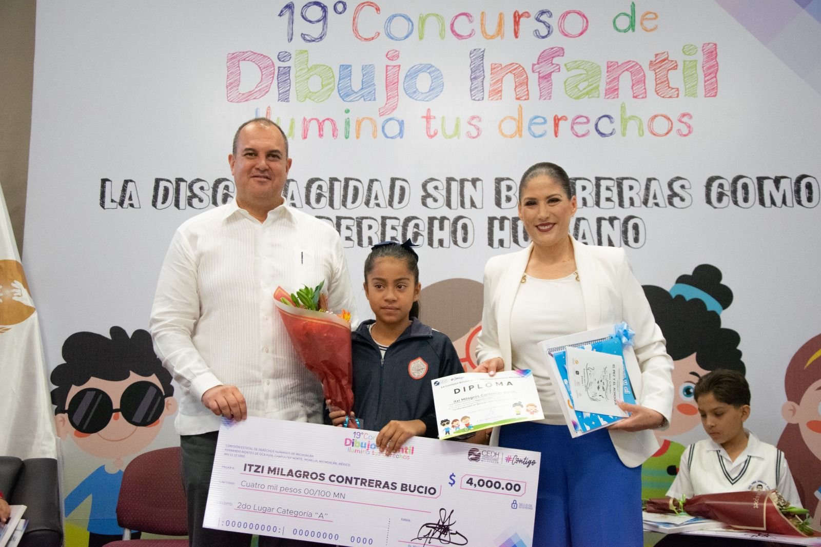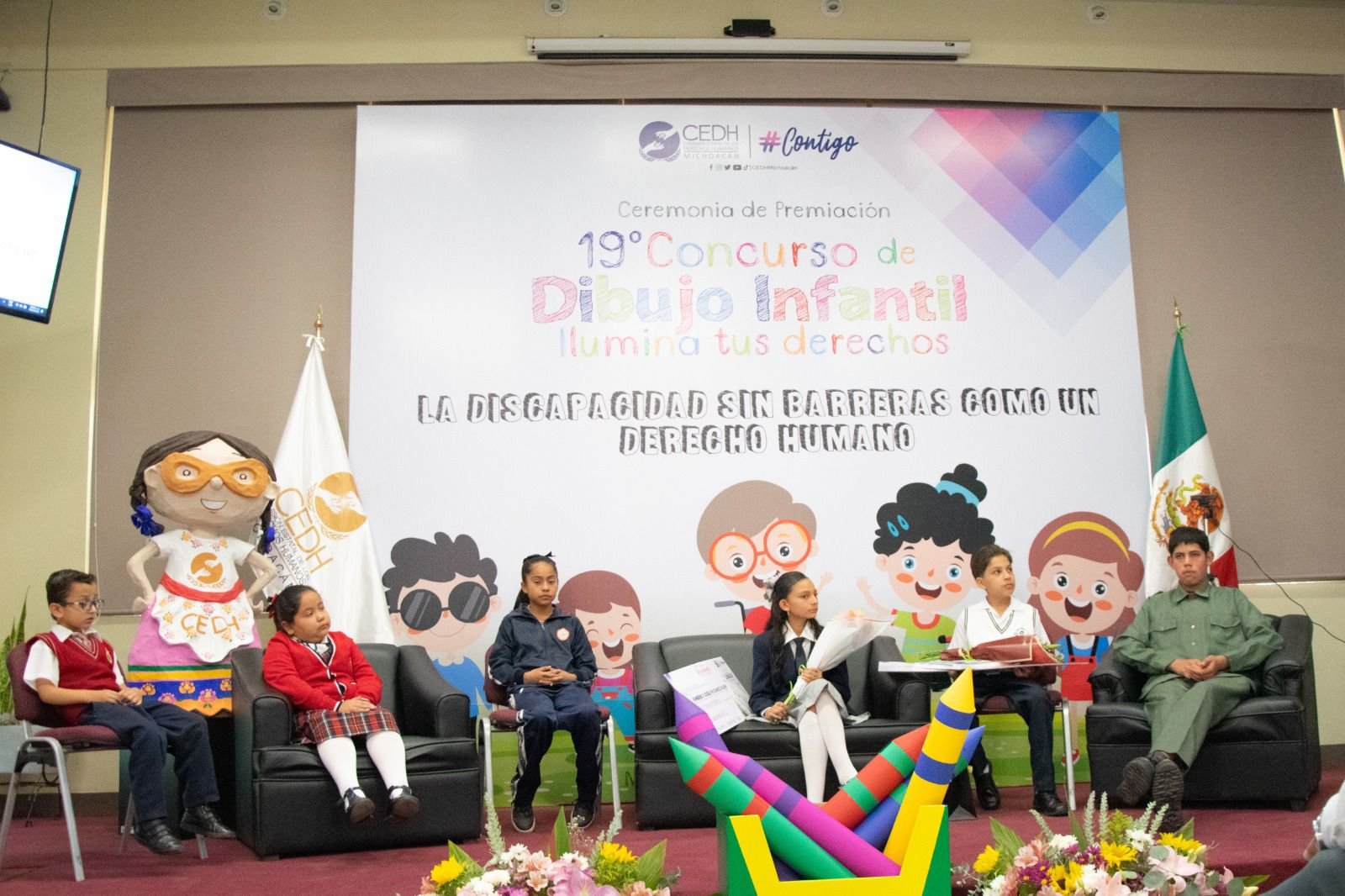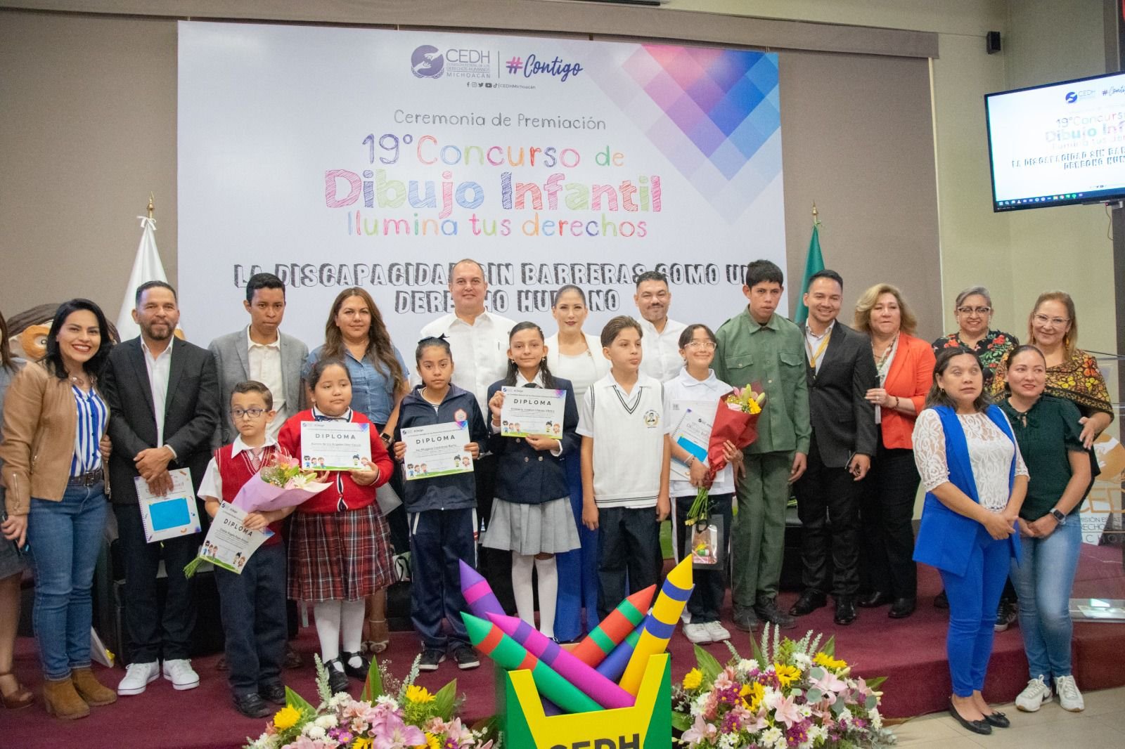 Morelia, Michoacán, a 16 de mayo de 2023.- El presidente de la Comisión Estatal de los Derechos Humanos en Michoacán, entregó los premios a los niños y adolescentes ganadores del 19° Concurso de Dibujo Infantil “Ilumina tus Derechos”, que en esta ocasión tuvo como tema “La discapacidad sin barreras como un derecho humano”.