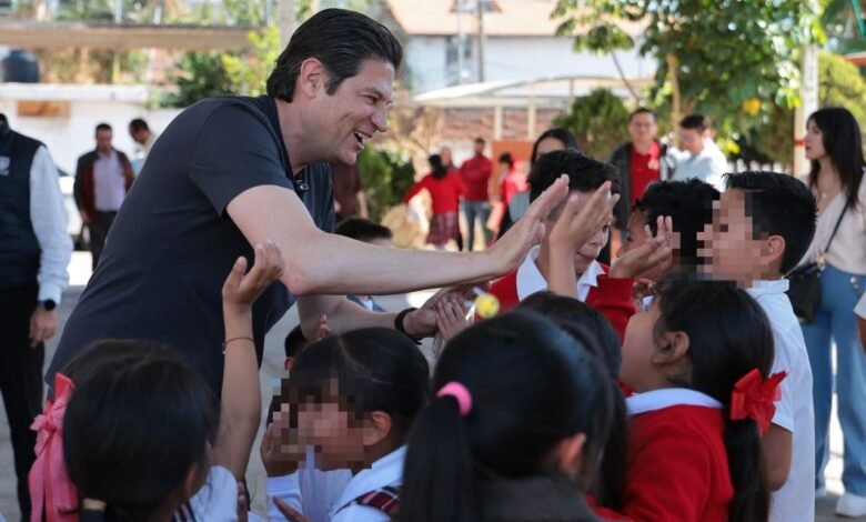 Morelia, Michoacán; 20 de enero de 2025.-El Presidente de Morelia, Alfonso Martínez Alcázar, fue recibido con alegría por cientos de alumnas, alumnos y directivos de la escuela primaria Benito Juárez en la colonia Sindurio, a quienes comprometió la construcción de una cancha deportiva dentro del plantel escolar.
