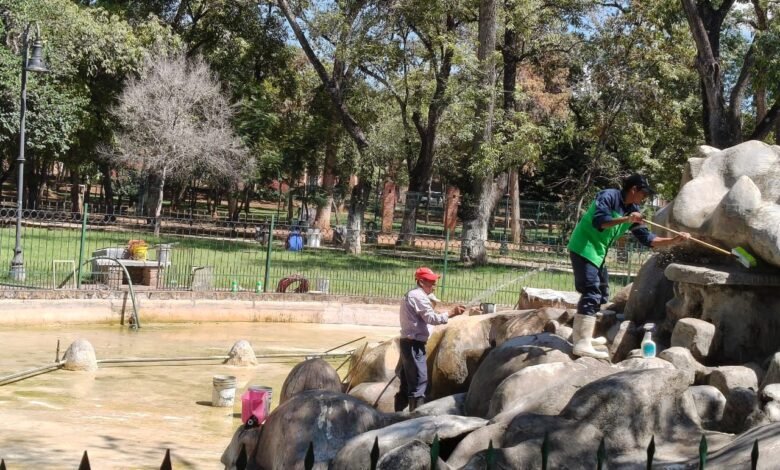 Morelia, Michoacán; 14 de octubre de 2025. — Personal del área de Parques y Jardines del Ayuntamiento de Morelia lleva a cabo trabajos de limpieza y mantenimiento en la Fuente de “Los Patos”, con el propósito de conservar este espacio en óptimas condiciones y salvaguardar el bienestar de los patos que habitan en el lugar.