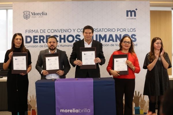 Morelia, Michoacán, a 08 de diciembre de 2025.- En el marco del Día Internacional de los Derechos Humanos, el Ayuntamiento de Morelia y la Comisión Estatal de los Derechos Humanos de Michoacán (CEDH) consolidaron su colaboración institucional mediante la firma de un convenio orientado a fortalecer la promoción, defensa y garantía de los derechos humanos en el municipio, reafirmando la visión de un gobierno humano, sensible y cercano a la ciudadanía impulsada por el presidente municipal, Alfonso Martínez Alcázar.