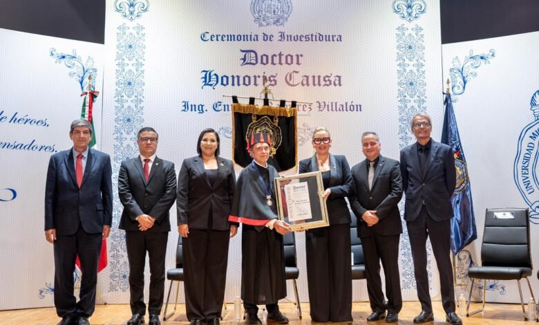 Morelia, Michoacán, a 05 de diciembre de 2025.- El ingeniero Enrique Ramírez Villalón fue condecorado con el Grado de Doctor Honoris Causa que otorga la Universidad Michoacana de San Nicolás de Hidalgo (UMSNH), en este marco, la rectora Yarabí Ávila González, señaló que el galardonado es un michoacano ejemplar, cuya visión empresarial ha trascendido fronteras y cuyo impacto social es reconocido en México y en el mundo.