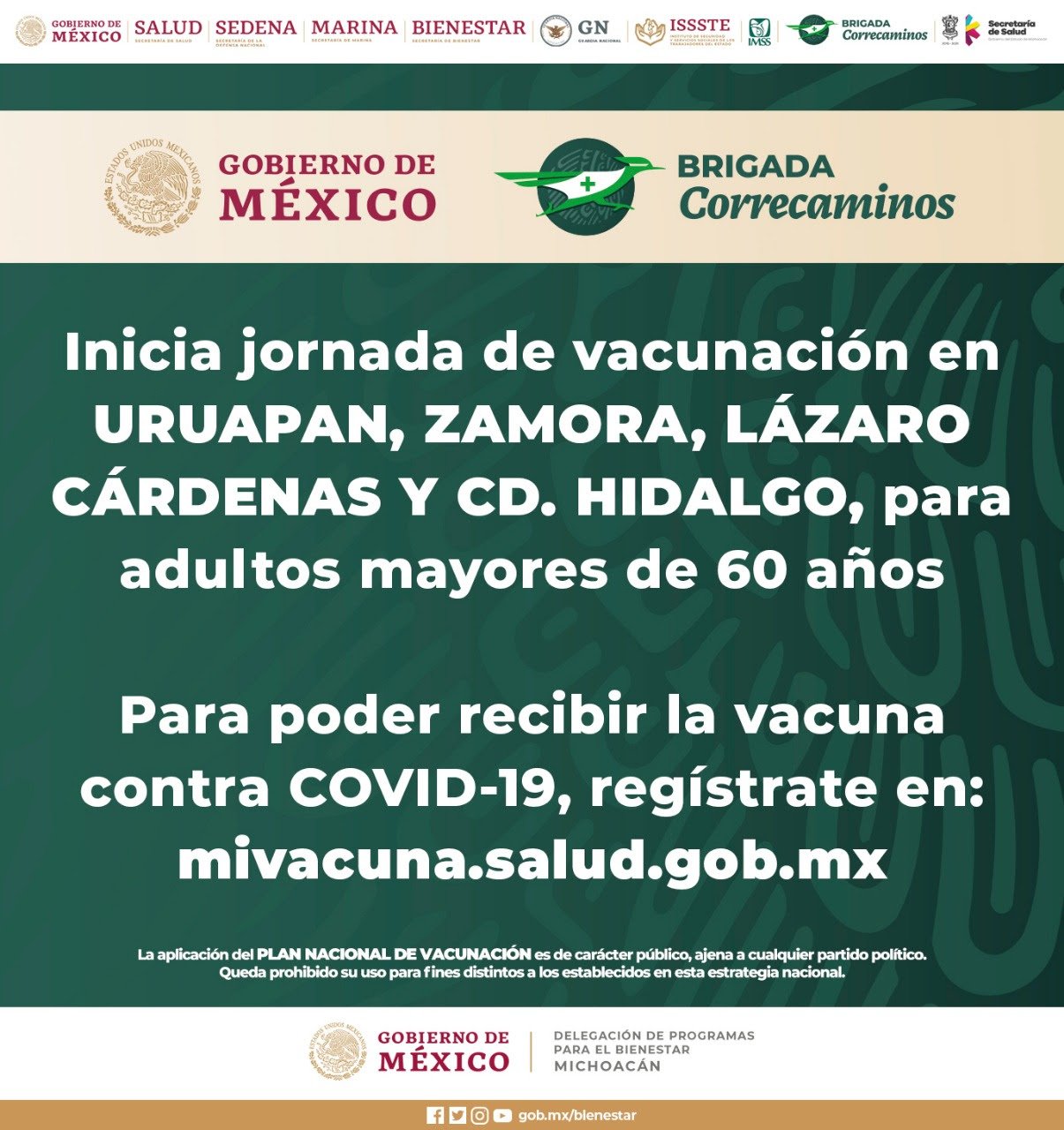 La Secretaría de Bienestar, Delegación Michoacán, hace un llamado a la población adulta mayor de dichos municipios, para que espere la convocatoria oficial de vacunación y acuda al centro que le corresponde, de acuerdo a la cita que le será asignada tras su registro en la página de Internet.
