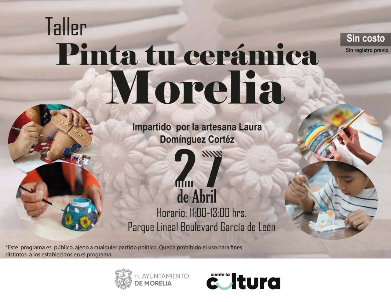 También, en el parque lineal se desarrollará el taller “Pinta tu Cerámica Morelia”, impartido por la artesana de la tenencia de Capula Laura Domínguez Cortez, quien ofrece sus piezas de cerámica elaboradas en su taller para enseñar la pigmentación de las mismas y las cuales son obsequiadas tras su intervención a los asistentes.