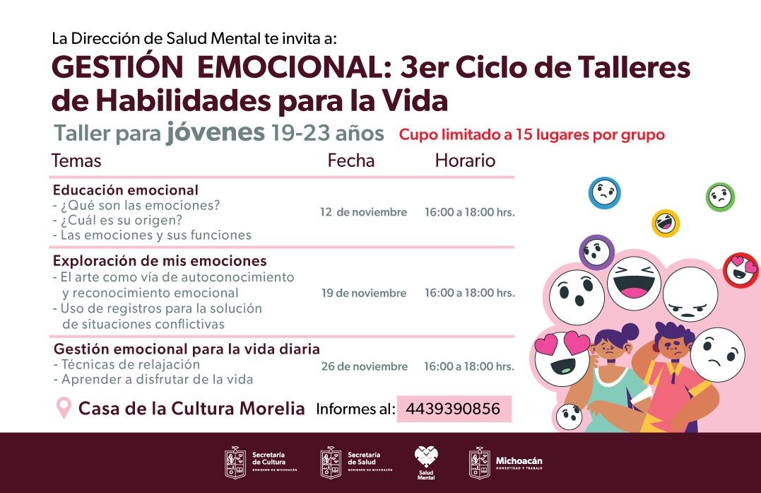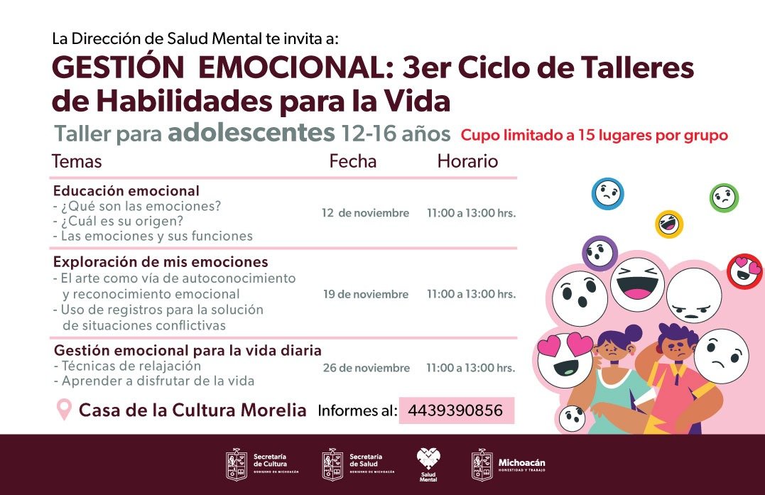 La educación y el manejo de las emociones, la prevención del suicidio y la depresión, así como la gestión emocional para la vida diaria, son los principales temas de estos talleres impartidos por psiquiatras de la SSM, capacitados para la atención de adolescentes y adultos.
