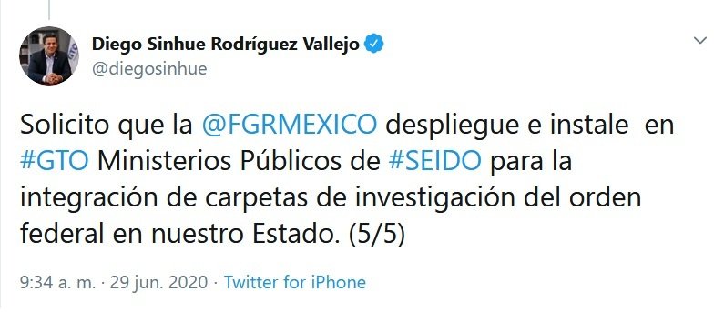 Por su contraparte el Gobernador de Guanajuato expreso su inconformidad en los señalamientos por medio de su cuenta de Twitter en donde se deslinda de cualquier responsabilidad, el solamente es el Gobernador de Guanajuato y sugiere que la Fiscalía General de la República debió haber atraído el caso.