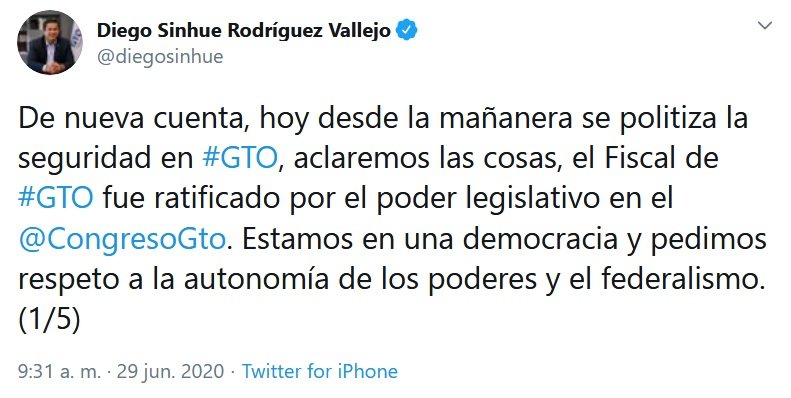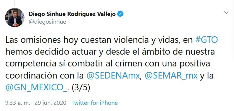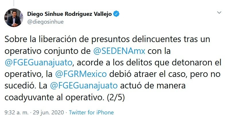 Por su contraparte el Gobernador de Guanajuato expreso su inconformidad en los señalamientos por medio de su cuenta de Twitter en donde se deslinda de cualquier responsabilidad, el solamente es el Gobernador de Guanajuato y sugiere que la Fiscalía General de la República debió haber atraído el caso.