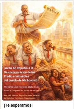 Este miércoles 11 de marzo de 2026, integrantes de varias organizaciones sociales se manifestarán frente a las oficinas del Congreso de Michoacán desde las 8 de la mañana, para plantear su inconformidad contra las y los legisladores, que llamaron traidores por poner a la venta bienes inmuebles propiedad del pueblo de Michoacán, no del Gobierno.