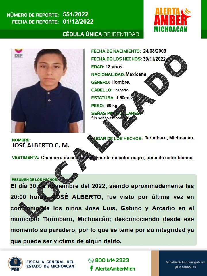 Los policías al checar su nombres se percataron que había alerta «Amber» emitida por la Fiscalía de Michoacán, de inmediato los retuvieron.