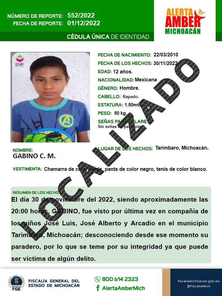 Los policías al checar su nombres se percataron que había alerta «Amber» emitida por la Fiscalía de Michoacán, de inmediato los retuvieron.