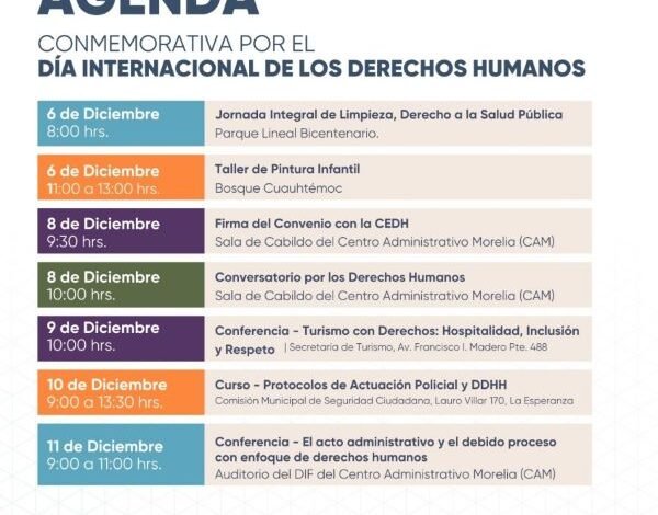 A través de esta agenda, el Gobierno de Morelia refrenda su compromiso de impulsar una ciudad más justa, segura e incluyente, donde los derechos humanos sean una guía permanente en la acción pública, por lo que se invita a la ciudadanía a participar y sumarse a estas actividades que promueven una convivencia basada en el respeto, la paz y la dignidad humana.