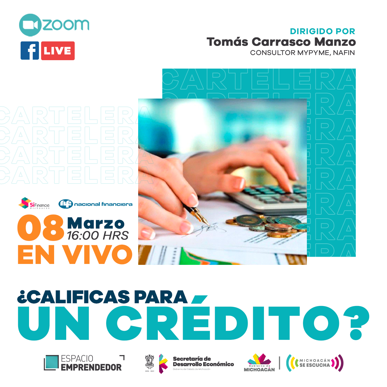 El mismo lunes en punto de las 16 horas, se ofrecerá el tema ¿Calificas para un crédito?, por parte de Tomás Carrasco Manzo, consultor de NAFIN, quien ofrecerá orientación para que el o la participante identifique elementos cuantitativos y cualitativos de selección, solicitud y evaluación de financiamiento.