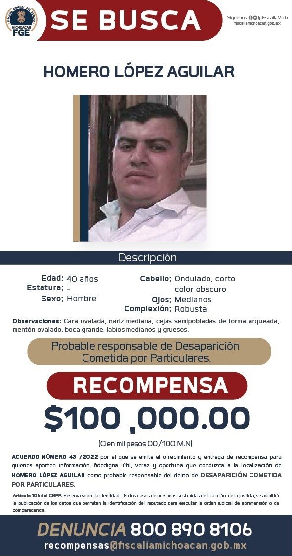 Morelia, Michoacán, a 29 de diciembre de 2022.- La Fiscalía General del Estado de Michoacán (FGE) ofrece recompensa para quienes aporten información fidedigna, útil y oportuna que conduzca a la localización de Homero López Aguilar, por su relación de la desaparición de una mujer, en Morelia.