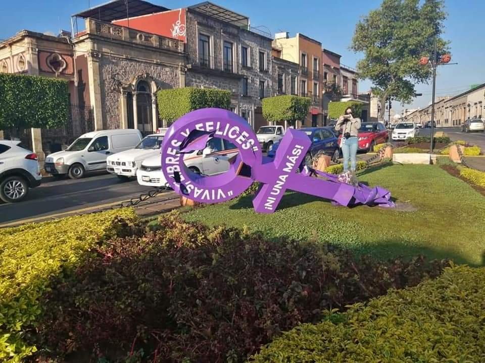 Y es que la estructura metálica color morado en el que se podía leer «Vivas, Libres y Felices, ¡ Ni Una Más !, apareció doblado y a punto de caer la mañana de este martes lo que obligó a algunas personas mejor a retirarlo para evitar algún accidente con alguna otra persona.