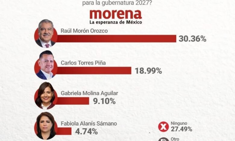 Mientras que otros aspirantes buscan posicionarse, las cifras demuestran que Morón es quien realmente cohesiona el voto ciudadano, con un 30.36% de las opiniones a su favor en la contienda interna, con lo que aventaja por casi 12 puntos al segundo lugar, Carlos Torres Piña.
