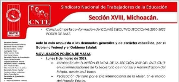 Lo que llamaron «Movilización Política de Masas», iniciará este lunes 8 de marzo con la instalación de un plantón estatal en las inmediaciones de la Secretaría de Finanzas y Administración del Estado desde las 08:00 horas y ahí mismo realizarán el «Foro por el Día Internacional de la Mujer», establecieron.