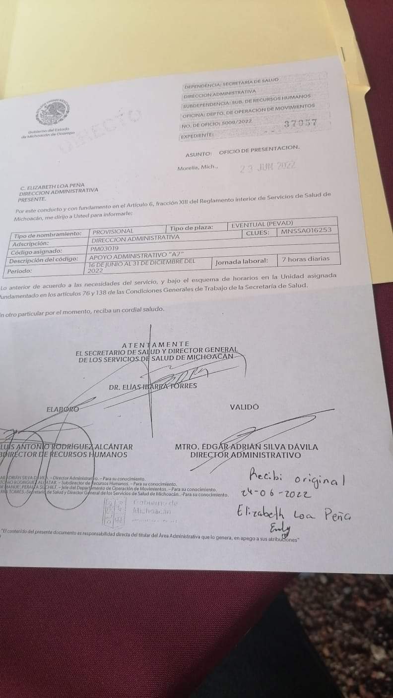 Una de ellas es Elizabeth L., quien de acuerdo a los documentos que los trabajadores de la dependencia colgaron en redes sociales, se le otorgó el pasado 6 de julio el cambio de estatus y clave a A7 Apoyo Administrativo, que sólo checa salida o entrada una vez al día ganando más dinero dentro de la Secretaría de Salud y con una plaza eventual pero de duración indefinida.