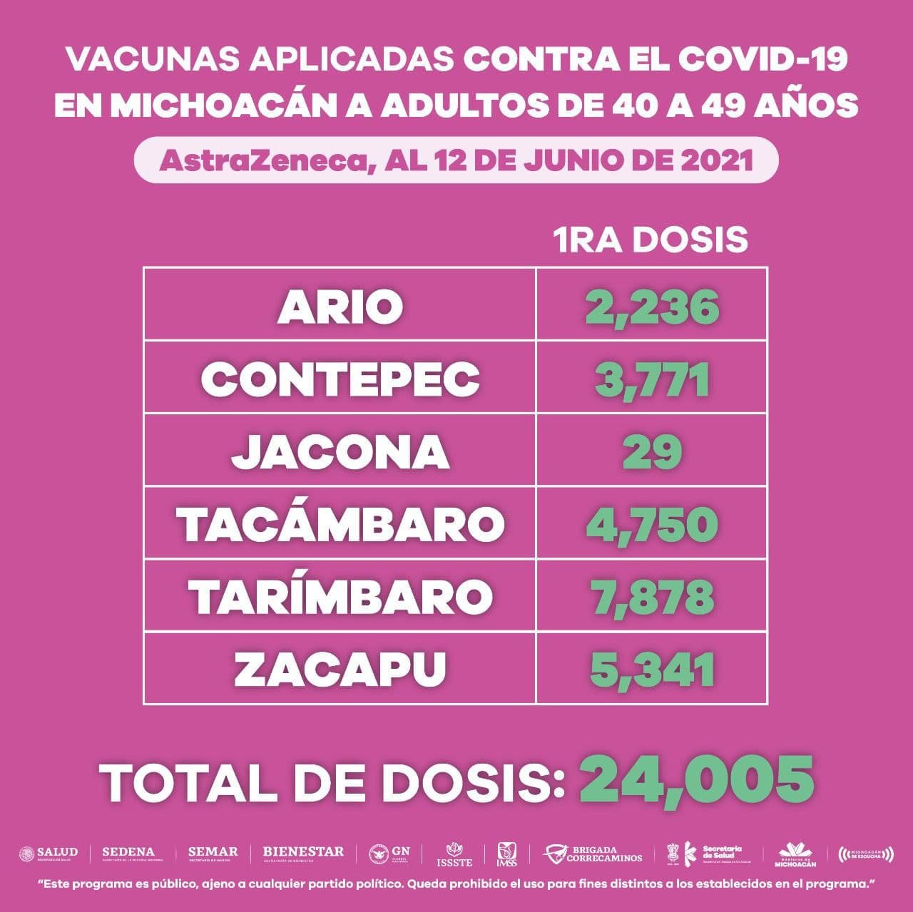Hasta el momento se han aplicado 48 mil 763 vacunas en beneficio de este grupo etario, de las cuales 24 mil 05 han sido del biológico de AstraZeneca para habitantes de Ario, Contepec, Jacona, Tacámbaro, Tarímbaro y Zacapu.