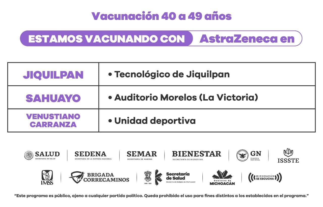 Morelia, Michoacán, a 12 de junio de 2021.- Se mantienen activos tres puestos de vacunación anti COVID-19, para la inmunización de personas de 40 a 49 años en los municipios de Jiquilpan, Sahuayo y Venustiano Carranza.