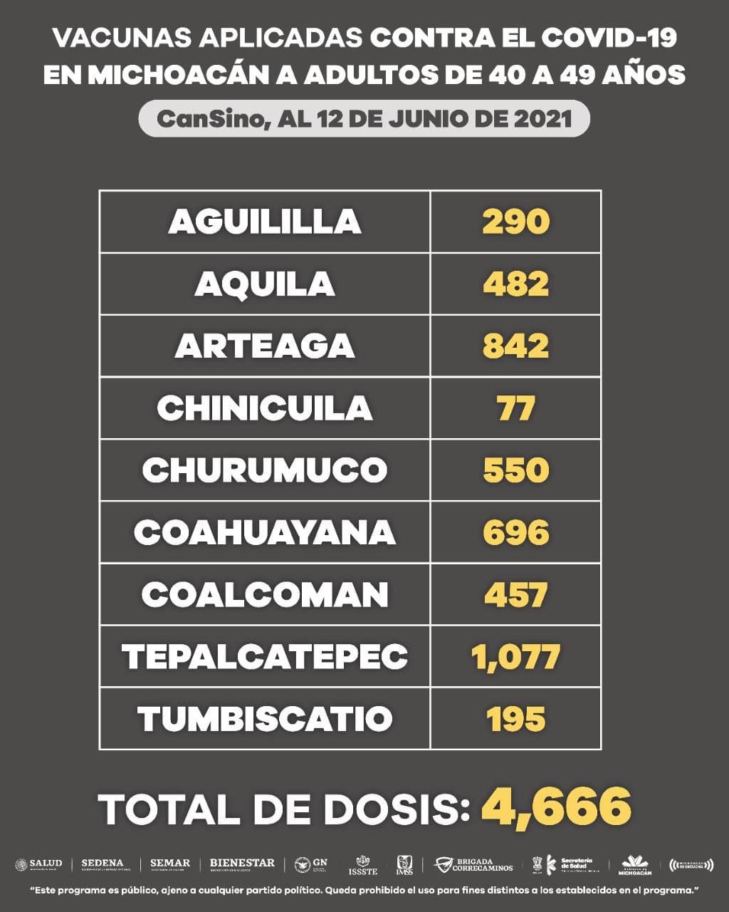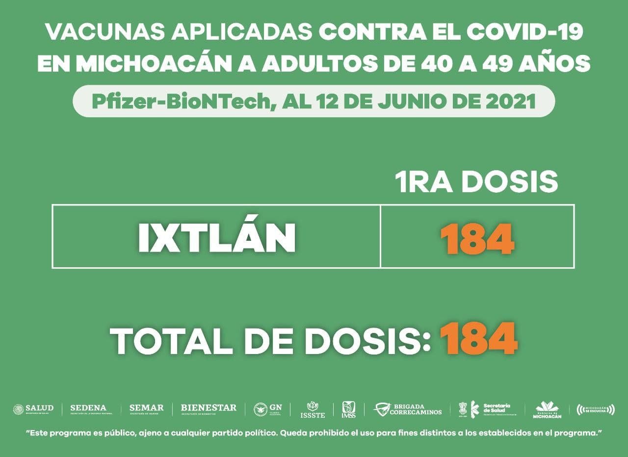 Para la gente de Hidalgo, Maravatío y Pátzcuaro, se tiene el registro de la aplicación de 19 mil 908 vacunas de Sinovac; mientras que en Ixtlán 184 de Pfizer y finalmente en Aguililla, Aquila, Arteaga, Chinicuila, Churumuco, Coahuayana, Coalcomán, Tepalcatepec y Tumbiscatío 4 mil 666 de CanSino.