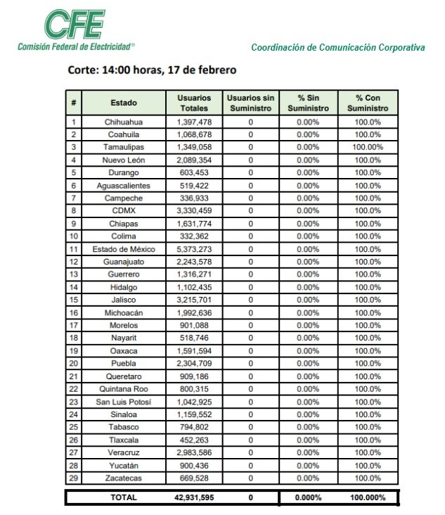A las 12:30 horas del 17 de febrero de 2021, se encuentran sin suministro 233 usuarios, en el estado de Tamaulipas, que representan menos del 0.001% del total de usuarios de la CFE en el país.