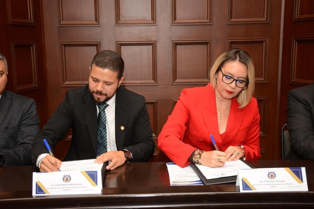 Morelia, Michoacán, a 24 de mayo de 2023.- “El amor que se le tiene a la Universidad Michoacana es muy grande y por eso tenemos el valor para tomar decisiones que ayuden a construir un escenario positivo para todas y todos”, afirmó la rectora Yarabí Ávila González, al firmar un convenio de colaboración con el titular de la Comisión Ejecutiva Estatal de Atención a Víctimas (CEEAV), Josué Alfonso Mejía Pineda.