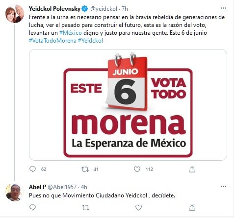 “Que vayan todos a votar y que no desperdicien el voto, que se lo den a Movimiento Ciudada… No, a Movimiento Ciudadano no, yo estoy contigo –le dijo a un candidato–, vamos todos juntos, pero que ya, de una vez por todas, denle a Movimiento Ciudadano su lugar”, señaló la ahora delegada de Morena en Jalisco, durante una entrevista televisiva.