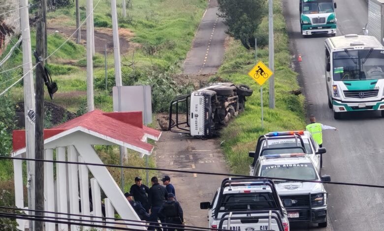 Morelia, Michoacán a 9 de agosto de 2025.- Un oficial de la Guardia Civil perteneciente al Agrupamiento Lacustre resultó lesionado esta mañana al volcar la patrulla que conducía en el pueblo de Noriega.