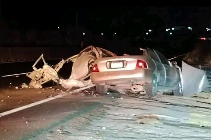 El vehículo Nissan Sentra, color gris, con placas LNL-447-D de Michoacán, totalmente destrozado en la parte frontal. Los socorristas encontraron al conductor ya muerto, tirado a varios metros del automóvil al salir disparado tras el impacto.