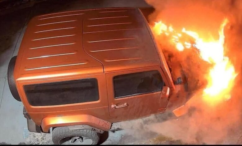 Morelia, 29 de agosto de 2025.- En la colonia Cuauhtémoc, un sujeto fue captado por las cámaras de seguridad colocando dos cajas de basura junto a una camioneta Jeep y posteriormente le prendió fuego, causando daños parciales a la unidad, que es propiedad de la panificadora «Cuixi Panificadora».
